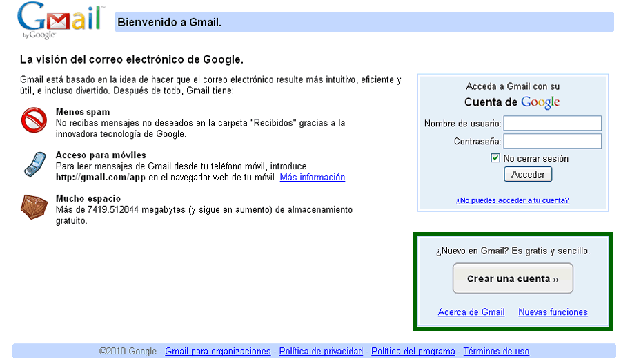 a http://www.gmail.com y haciendo clic sobre la opción Crea una cuenta.