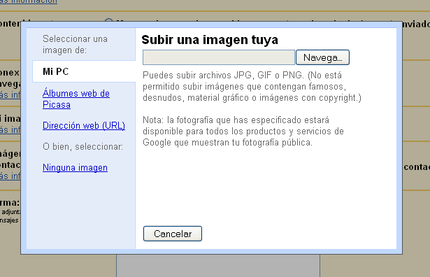 - Tienes más de una opción para cargar una imagen: localizarla en tu PC, en Picasa (otro servicio de Google para publicar