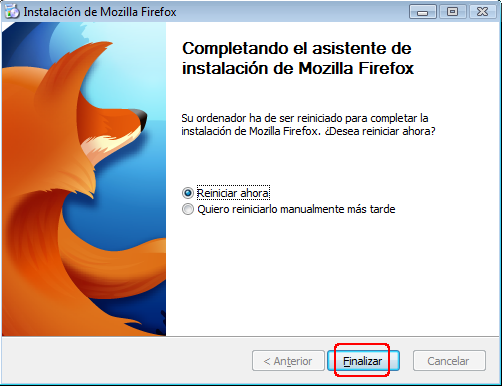 Cuando el programa se haya terminado de instalar, deberás reiniciar el ordenador. Puedes permitir a Firefox que se encargue de reiniciarlo (Reiniciar ahora) o hacerlo manualmente si tienes abiertas algunas otras aplicaciones y temes perder información.