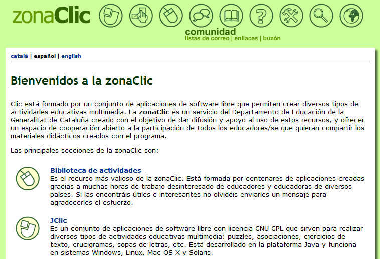 | Zona Clic es un sitio que permite la búsqueda de pequeñas aplicaciones para el aula elaboradas con Jclic, un programa especialmente diseñado para crear rompecabezas, actividades de parejas, y otras actividades para el aula. |