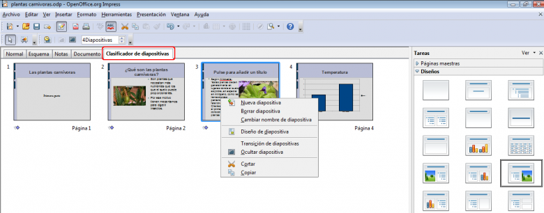 Para modificar el orden de las diapositivas o el efecto de transición, el tiempo de duración de cada diapositiva, o escoger un grupo para realizar alguna acción, usa el modo de visualización Clasificador de diapositivas. Haciendo clic con el botón derecho del ratón sobre una diapositiva, accederás a una serie de opciones que se aplicarán a la selección: