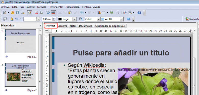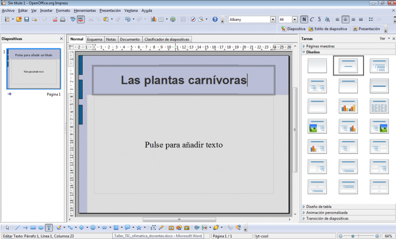 El uso de diapositivas en las presentaciones de temas, en eventos especiales o en las clases más comunes se generaliza cada día más. Con Impress podrás crear tus presentaciones de diapositivas y trabajar con los alumnos en la creación de presentaciones de temas, cuentos, trabajos prácticos, etc. En estas diapositivas podrás insertar elementos de todo tipo, desde hojas de cálculo hasta esquemas, animaciones y vídeo.
