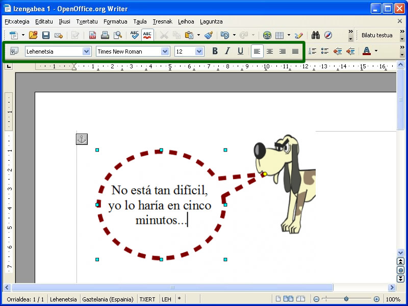 Erabili tresna-barrak letra-tipoa, letraren tamaina edo itxura aldatzeko. Testuaren tamaina laukia baino handiagoa bada, hautatu testua (saguarekin edo maiuskularen tekla sakatuta edukirik geziak erabilita) eta egin klik Reducir fuente (Murriztu letraren tamaina) aukeraren gainean.