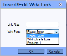 El icono del editor nos permite crear un enlace a otra página de nuestro wiki. Para poder crear el enlace será necesario antes haber creado otras páginas. Éstas aparecerán en el menú desplegable del campo Wiki page y simplemente seleccionando la página que nos interesa, el vínculo se insertará en el texto u objeto que tengamos seleccionado, en el contenido de la página que editamos.